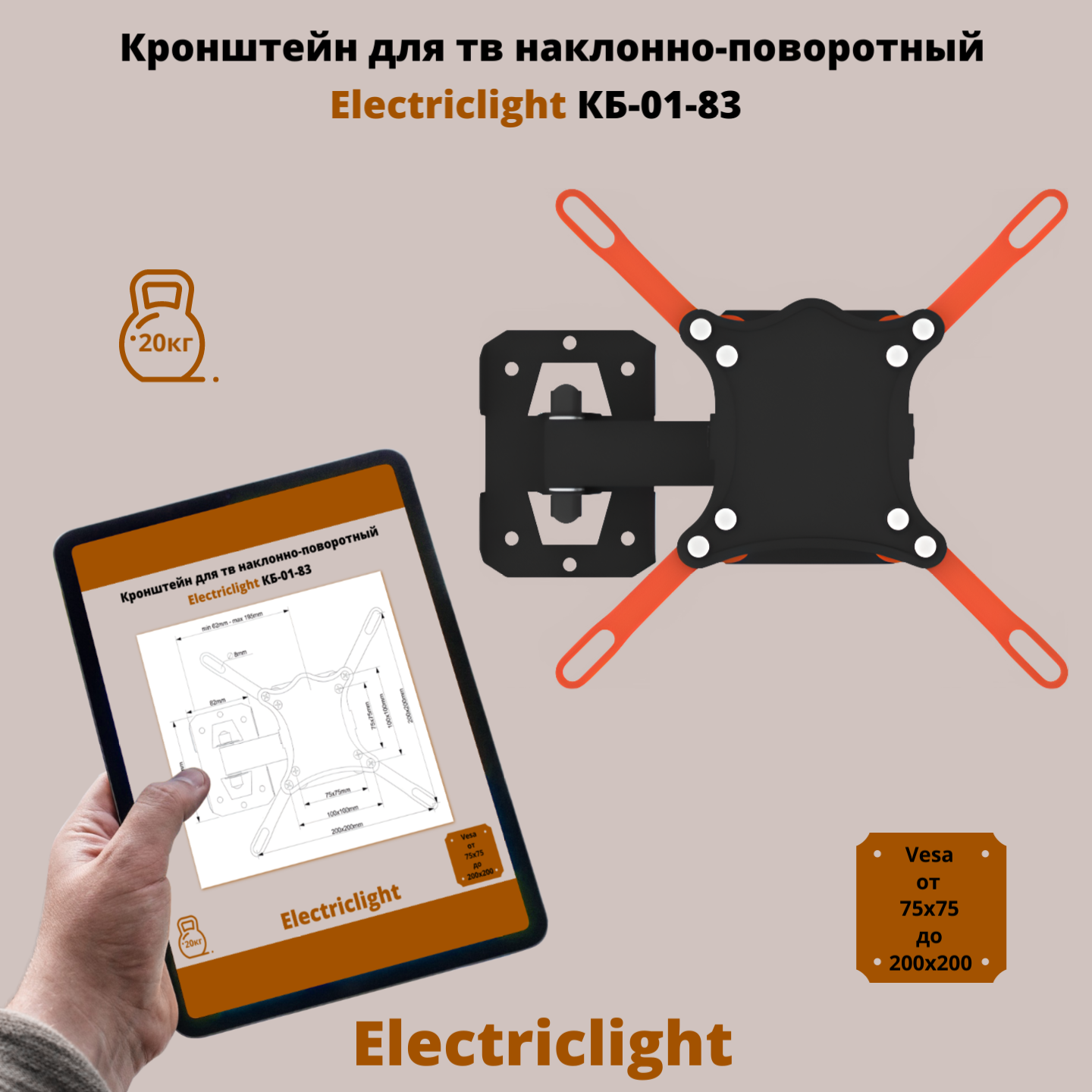 Кронштейн для телевизора Electriclight КБ-01-83 с наклоном и поворотом до 20кг 14..42 дюйма VESA до 200мм, чёрный