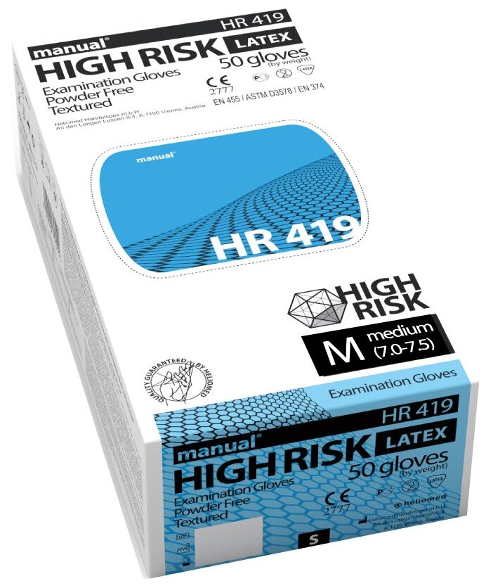 Перчатки латексные медицинские Manual High Risk HR419, M, 50шт., неопудренные, особо прочные, картонная коробка ( Артикул 310690 )