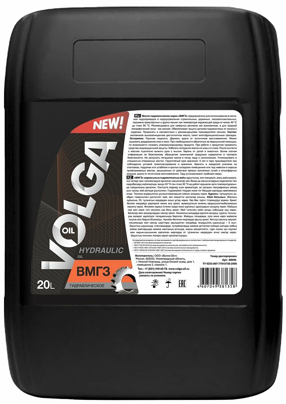 VOLGA-OIL 80046 Масло гидравлическое минеральное ВМГЗ 20л