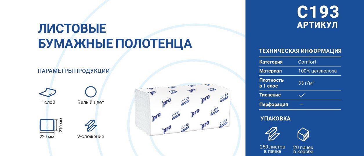 Полотенца бумажные листовые PROtissue С193 V, 1 сл., 250 л., 1 пачка, Comfort