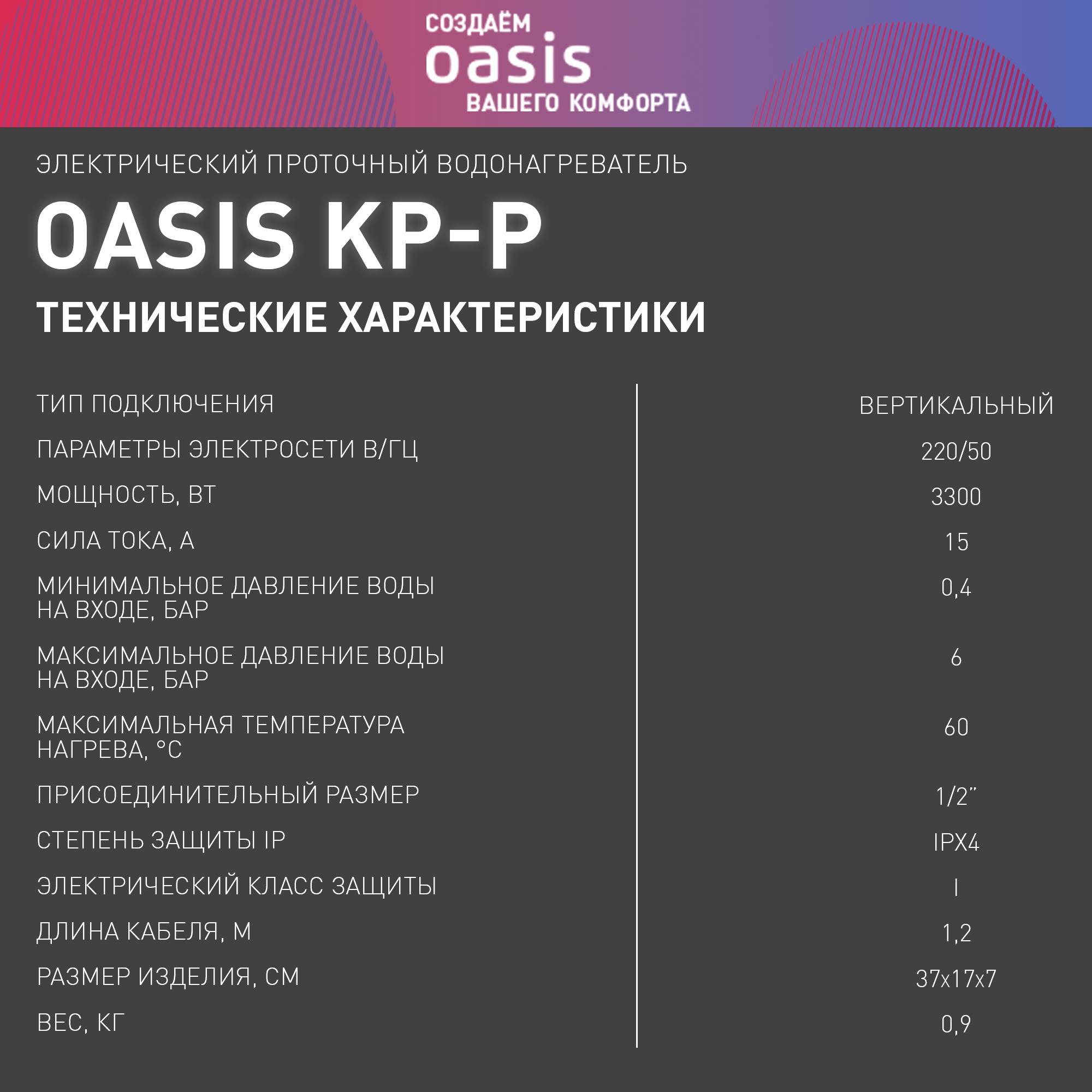 Проточный водонагреватель OASIS KP-P (X), 3300W