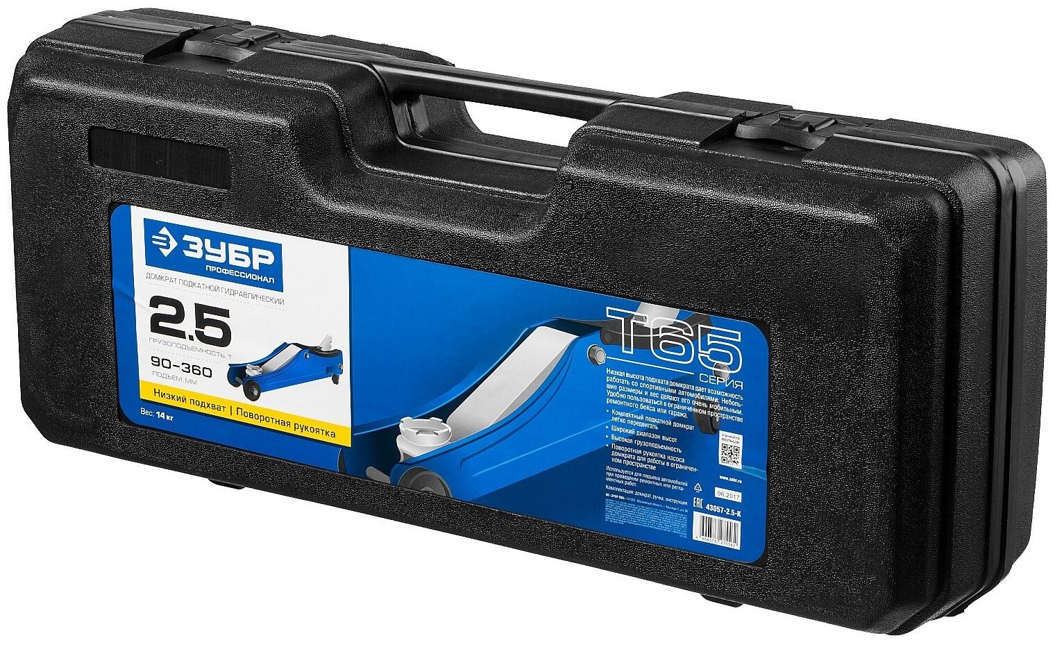 ЗУБР Т-65-K 2.5т 90-360мм подкатной домкрат с низким подхватом и поворотной ручкой в кейсе, Профессионал