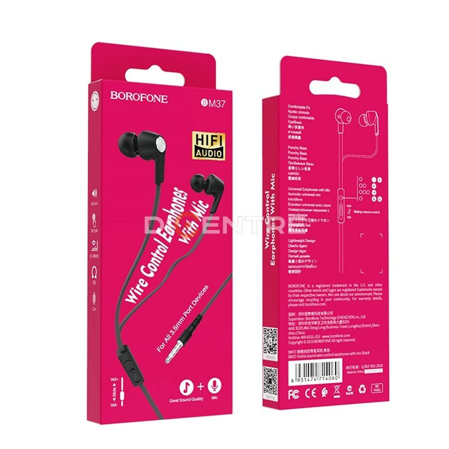 Наушники внутриканальные Borofone BM37, Noble, микрофон, кнопка ответа, регулятор громкости, цвет чёрный
