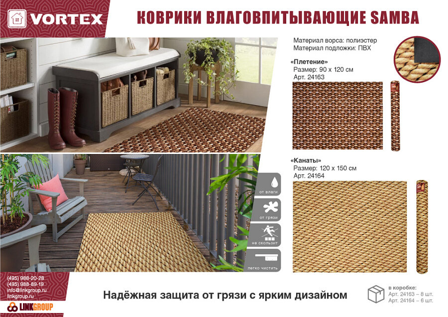 Коврик придверный влаговпитывающий Samba 120x150 Канаты VORTEX 24164 интересное: