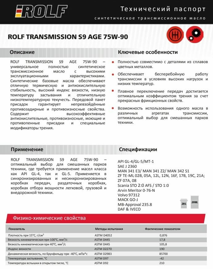 Масло Трансмиссионное Синтетическое Rolf Transmission S9 Age 75W-90 20Л ROLF арт. 322091