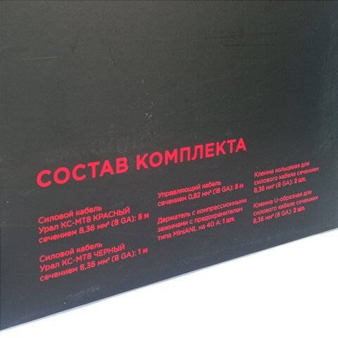 | Комплектация | силовой кабель КСнетМТ8 красный: 5 м сечением 8 GA (8,36 мм²); силовой кабель КСнетМТ8 черный: 1 м сечением 8 GA (8,36 мм²); 1 держатель с компрессионными зажимами с предохранителем типа MiniANL на 40А; управляющий кабель сечением 18GA (0,82 мм²): 5 м; 2 клеммы кольцевых для силового кабеля сечением 8 GA (8,36 мм²); 2 клеммы Uнетобразных для силового кабеля сечением 8 GA (8,36 мм²) |
