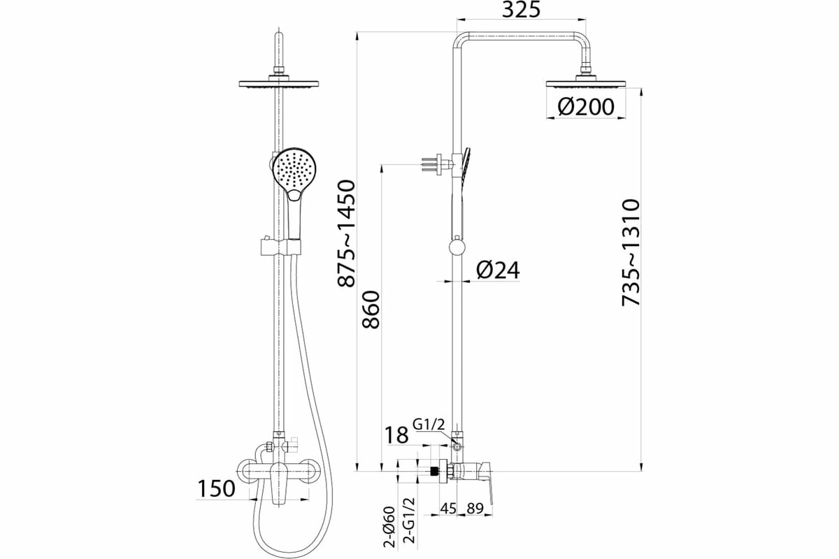 | Высота стойки для душа | 1450 мм |