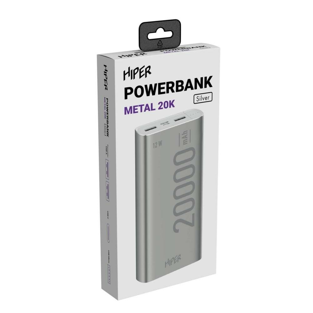Аккумулятор внешний универсальный HIPER METAL 20K SILVER 20000mAh, Intput: micro-USB, USB-C: Output: 2*USB 5V/2,4A, Max 12W Silver