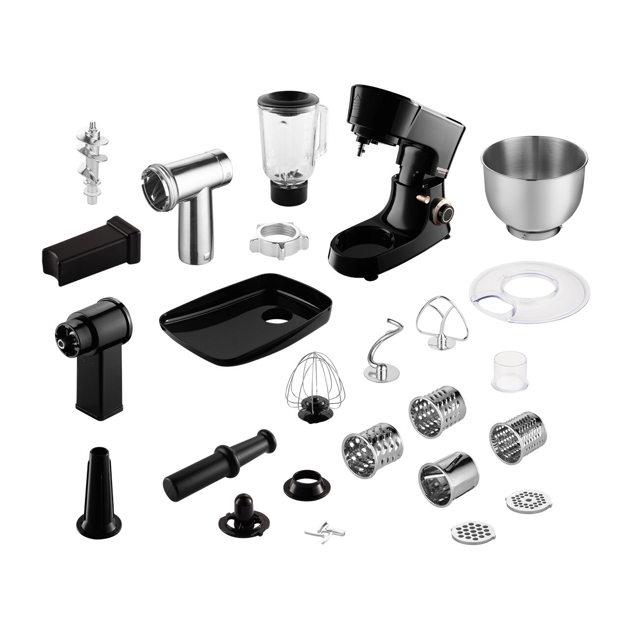 Покупали эту машину на юбилей коллеге. Юбиляр счастлив. В комплекте кроме планетарного миксера, мясорубка, блендер, и даже овощерезка. По словам коллеги, мясорубка достаточно мощная, крутит бодро, не засоряется, ничего в ней не застревает, нож острый, с самозаточкой. Блендер со съемными ножами, очень просто отмывается. Весьма вместительная, отлично отполирована. Все это вместе выглядит очень достойно.