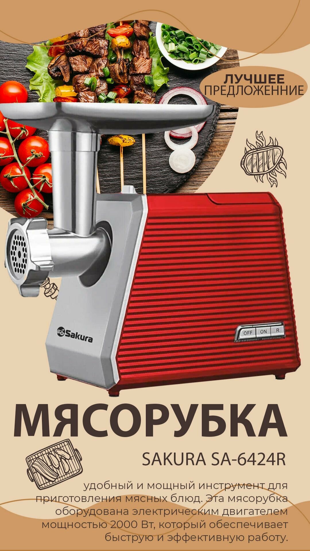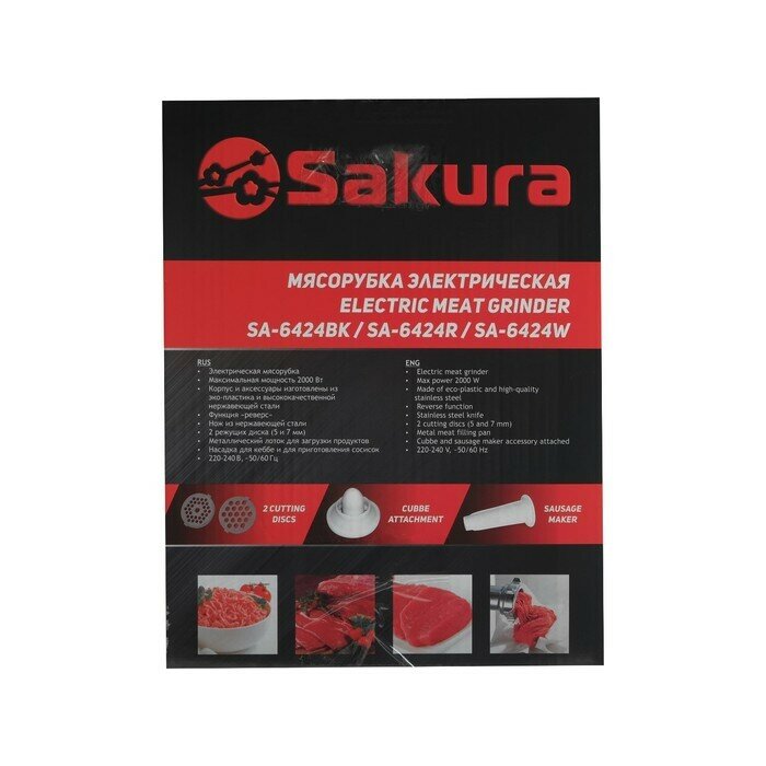 Мясорубка электрическая Sakura SA-6424R, 2000 Вт, насадки для колбас и сосисок, красная SAKURA 49098 .