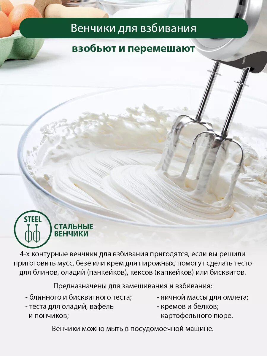 | Отзыв: | Купил недавно, понравилось как выглядит и пока меня устраивает. Во-первых, он достаточно мощный и имеет 5 скоростей. Я обычно включаю максимум 3 скорости. Во-вторых, им удобно работать - удобно лежит в руке. В-третьих, особенно хорошо взбивается тесто. Итак, советую попробовать. |