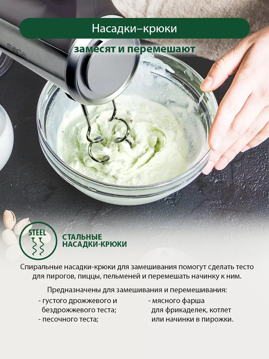 | Плюсы: | стильный, удобный в использовании, несколько скоростей, крючки для замешивания теста |