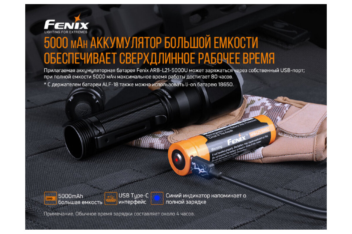 | Подробная комплектация | Фонарь TK22 UE, аккумулятор Fenix ARB-L21-5000U USB 21700 Li-ion (с зарядным портом Type-C), кабель для зарядки USB Type-C, клипса, ремешок на руку, чехол (с регулируемой длиной), запасное уплотнительное кольцо, переходник ALF-18, инструкция, гарантийный талон |