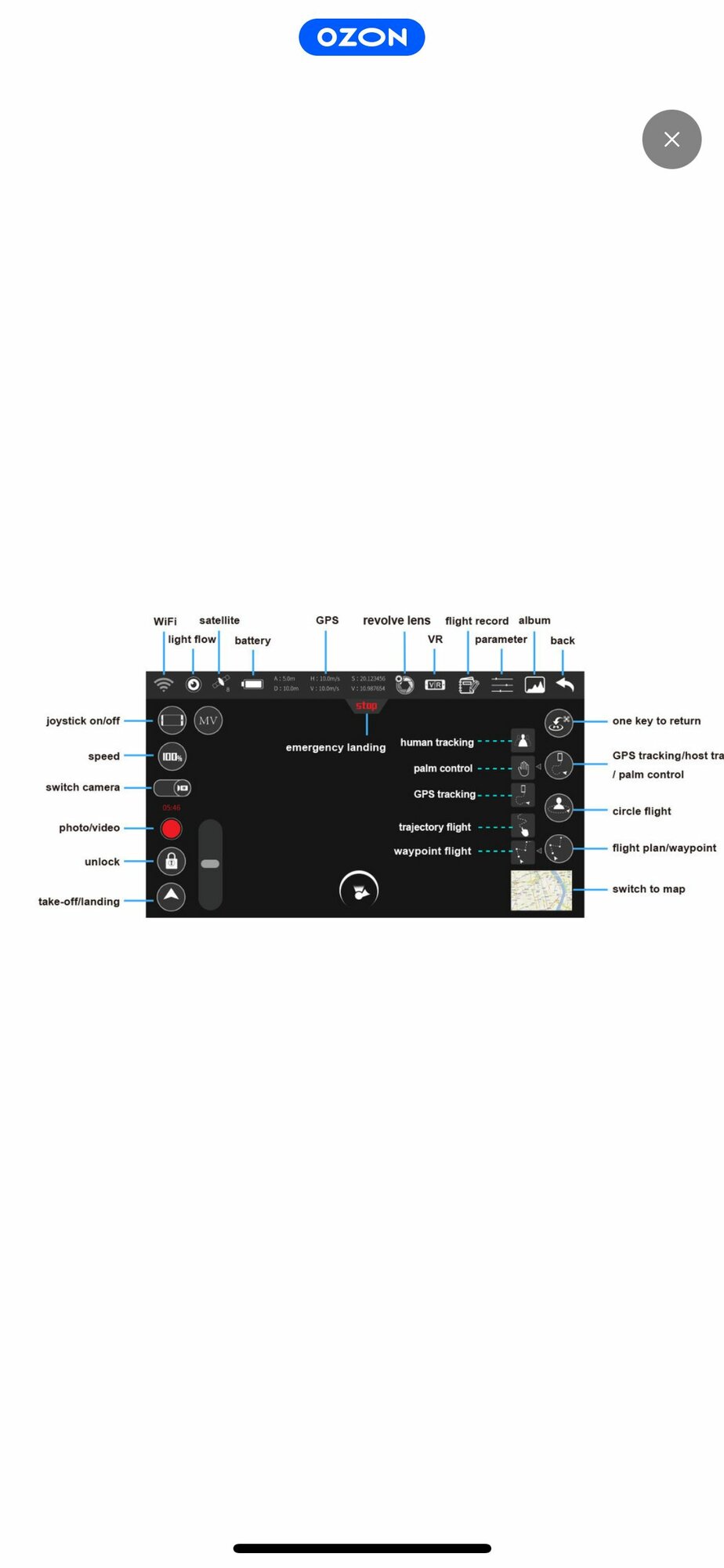 | Функции | автоматический взлет и посадка / вид от первого лица (FPV) / возврат одним нажатием / возвращение в точку взлета / облет заданных точек / следование за оператором |