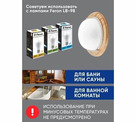 Светильник накладной Feron НБО 03-60-011 IP54, 220V, 60Вт, Е27, дерево, клен, круг
