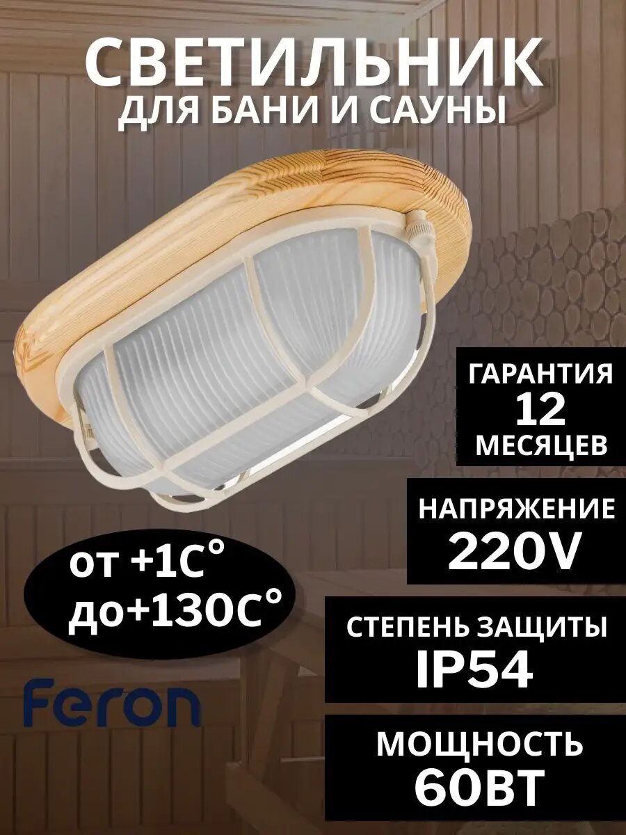 Светильник для бани и сауны FERON НБО 04-60-012 220V 60Вт Е27 IP54 дерево, клен, овал, с решеткой 11572