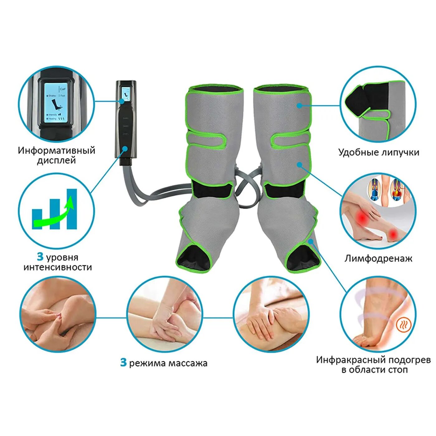 | Плюсы: | Простое управление, три программы, каждая с регулируемой интенсивностью воздействия, охват ног до верхней трети голени, возможность подогрева или его отключения, тихая помпа. |