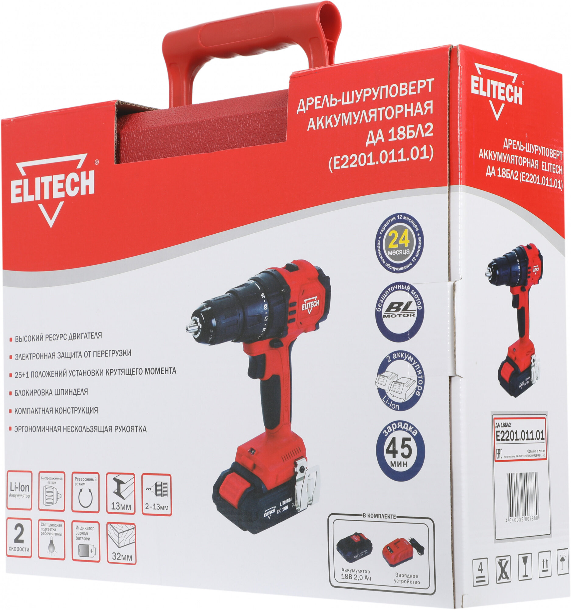 Дрель-шуруповерт Elitech ДА 18БЛ2 2Ач, с двумя аккумуляторами [e2201.011.01]
