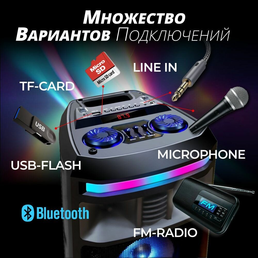 Портативная беспроводная блютуз колонка / Музыкальный центр Ginzzu GM-208 с функцией Bluetooth v4.2 , Гарантия 2 года, 50Вт, USB-flash, microSD, FM-радио, пульт ДУ, эквалайзер, караоке, динамическая LED подсветка динамиков интересное: