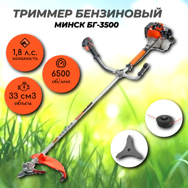 Бензиновый триммер Минск БГ-3500, отличная мотокоса для ухода за приусадебным участком с системой гашения вибрации, укомплектован: нож 3Т, катушка с леской КТ, ремень, мерный бачок, набор ключей.
