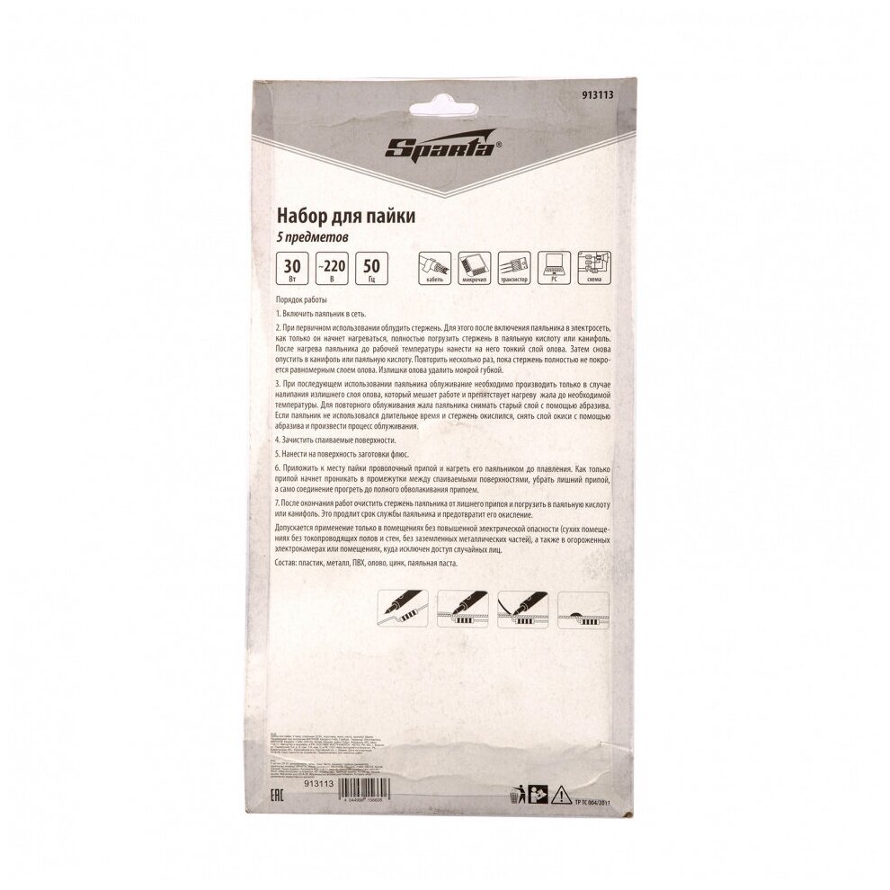 Sparta Набор для пайки, 5 предметов: паяльник 30 Вт, подставка, жало, паста, припой 913113 .