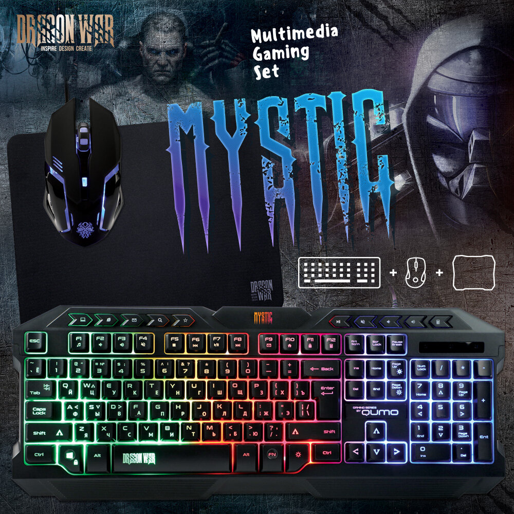 Игровая клавиатура QUMO Mystic (104 + 10 клавиш мультимедиа) + мышь проводная, оптическая, 1200/1600/2400/3200 + коврик
