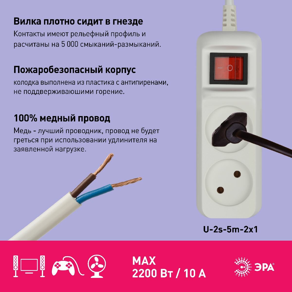 ЭРА U2s5m2x1 Удлинль без заземл, с выкл, 2гн, 5м, Пвс, 2х1мм2, 10А 20/720 Б0044048 .