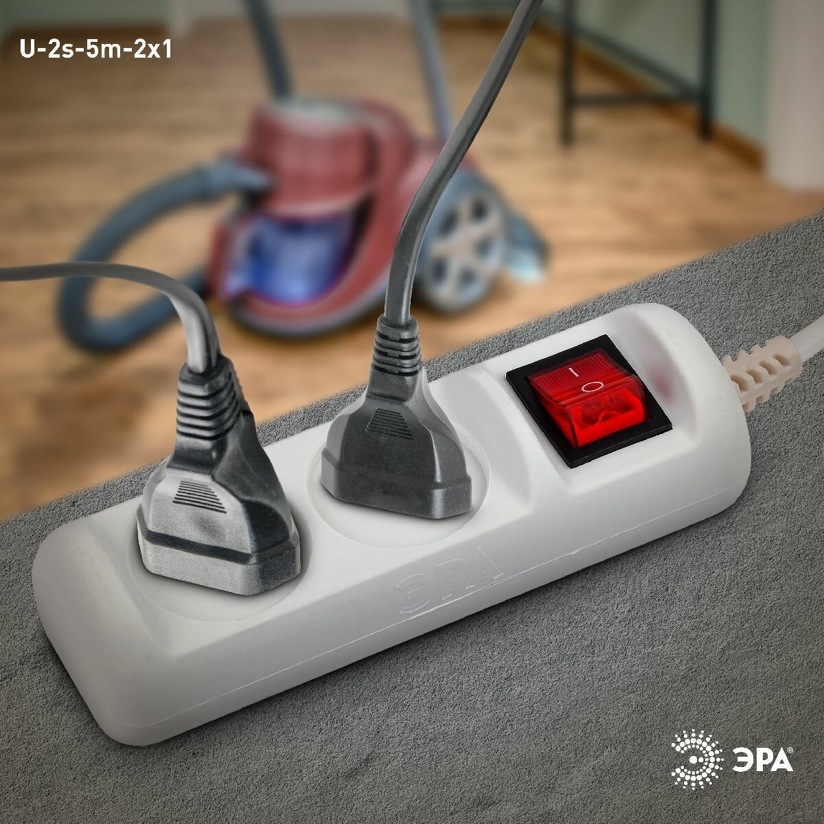 Удлинитель ЭРА U-2s-5m-2x1 без заземления с выключателем 2 розетки 5м 10А