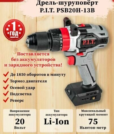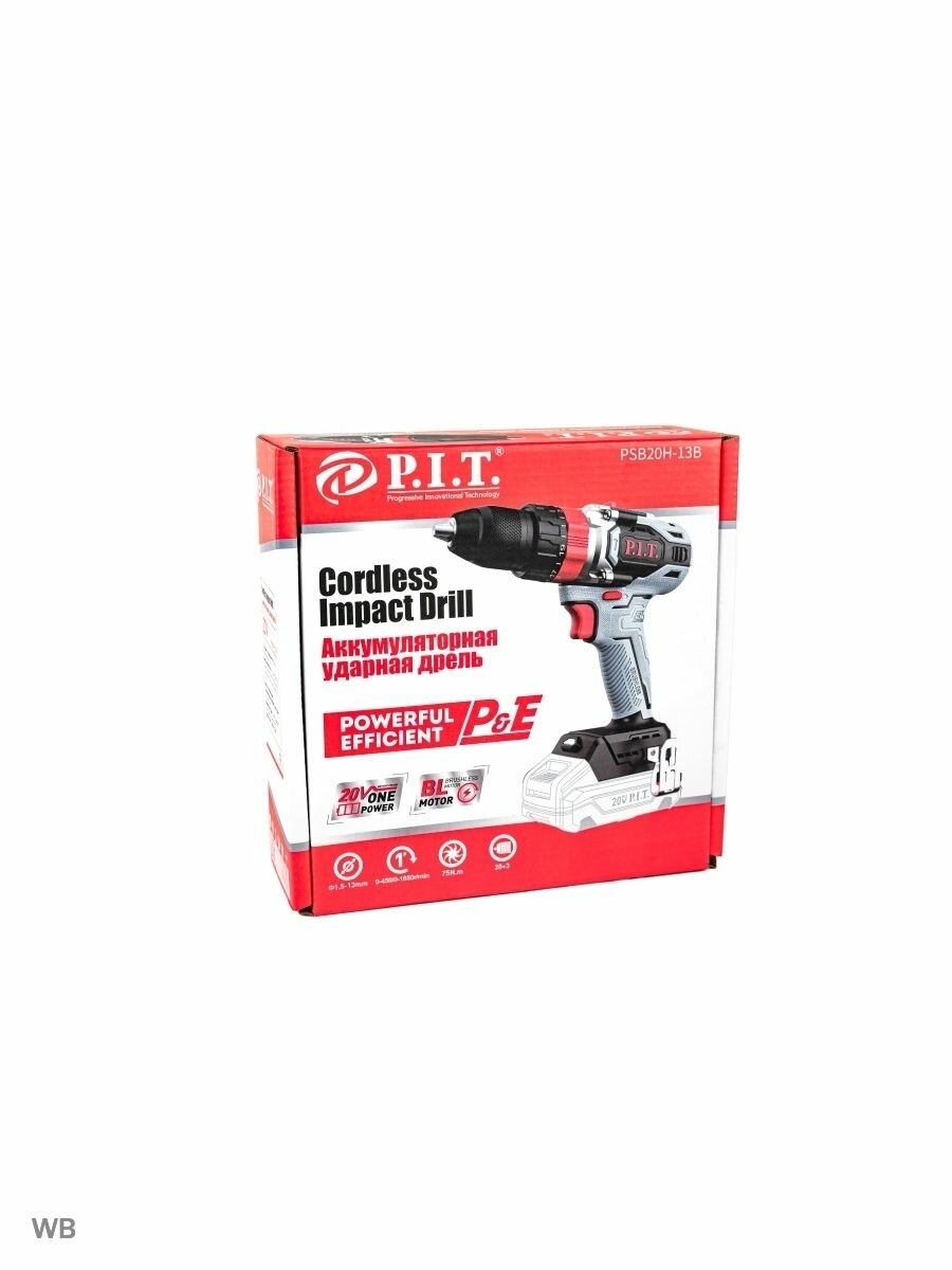 Аккумуляторная ударная дрель P.I.T бесщеточная PSB20H-13B SOLO (20В, 75Нм, метал патр13мм, 2ск, коробка)