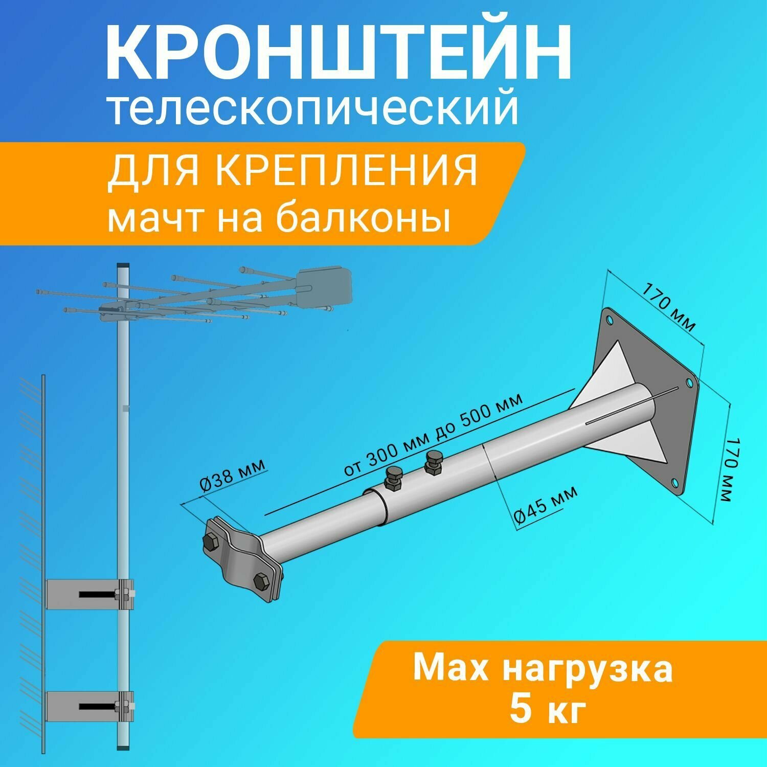 Кронштейн телескопический для крепления мачты антенны, вылет от стены 30-50 см
