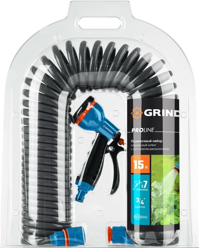 Купить GRINDA спиральный шланг 3/8″x15м, пистолет-распылитель, адаптеры, поливочный набор, PROLine (428495)