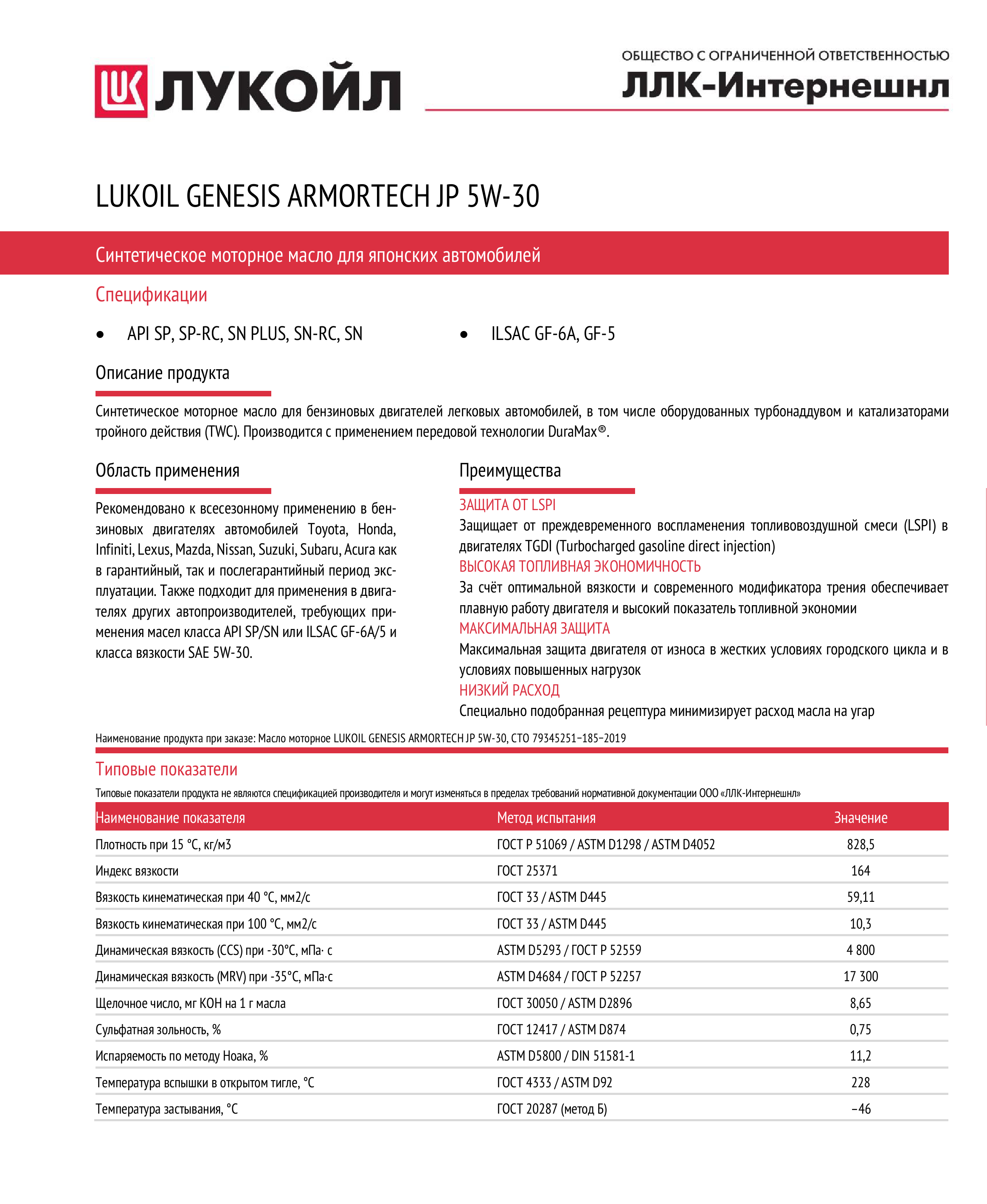Масло лукойл 5w30 genesis armortech jp api sp/sp-rc ilsac gf-6a 1л син