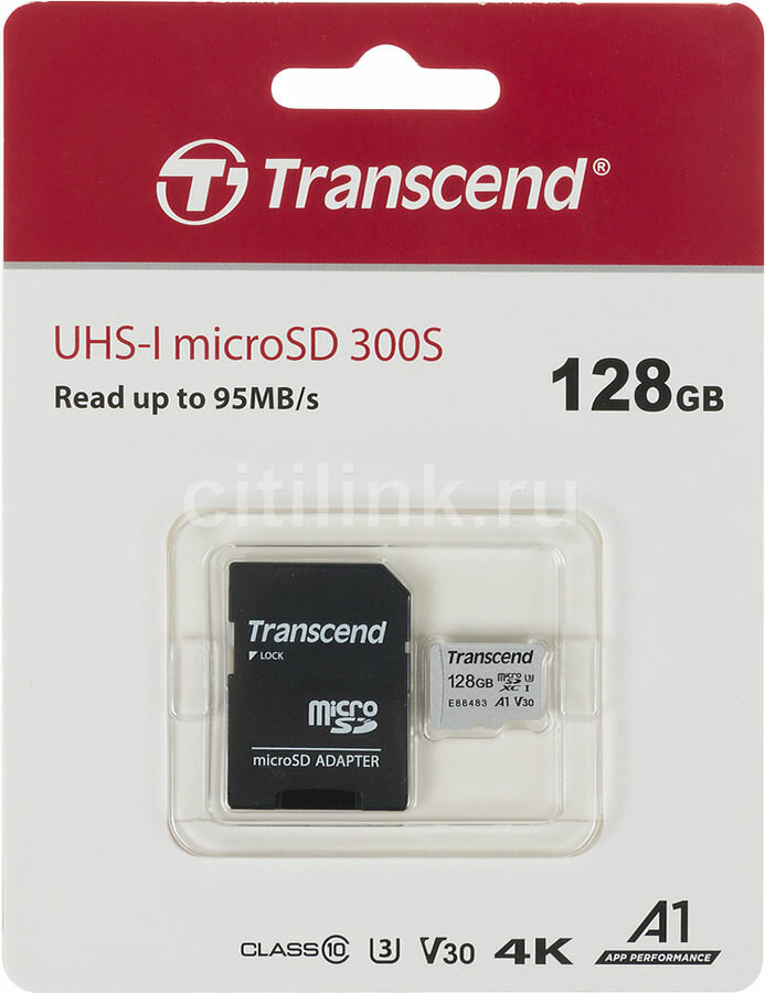 Карта памяти microSDXC UHS-I U3 Transcend 128 ГБ, 100 МБ/с, TS128GUSD300S