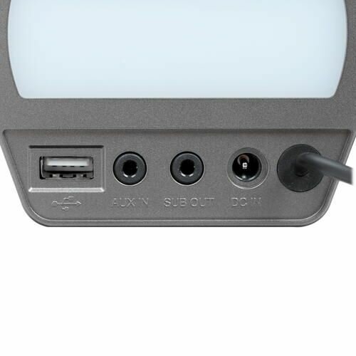 Куча вариантов подключения: блютуз, аудио кабель, usb. Светодиодную подсветку можно выключить. Не фонят. |