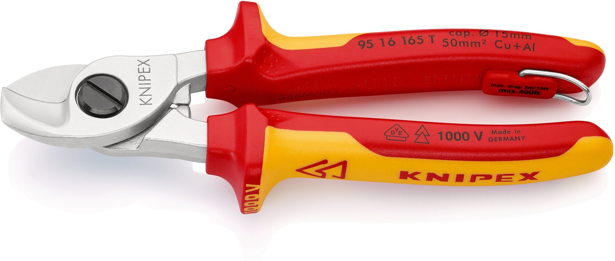 Кабелерез KNIPEX VDE, d 15 мм (50 кв. мм.), длина 165 мм, хром, 2-комп диэлектрические ручки, проушина для страховки KN-9516165T