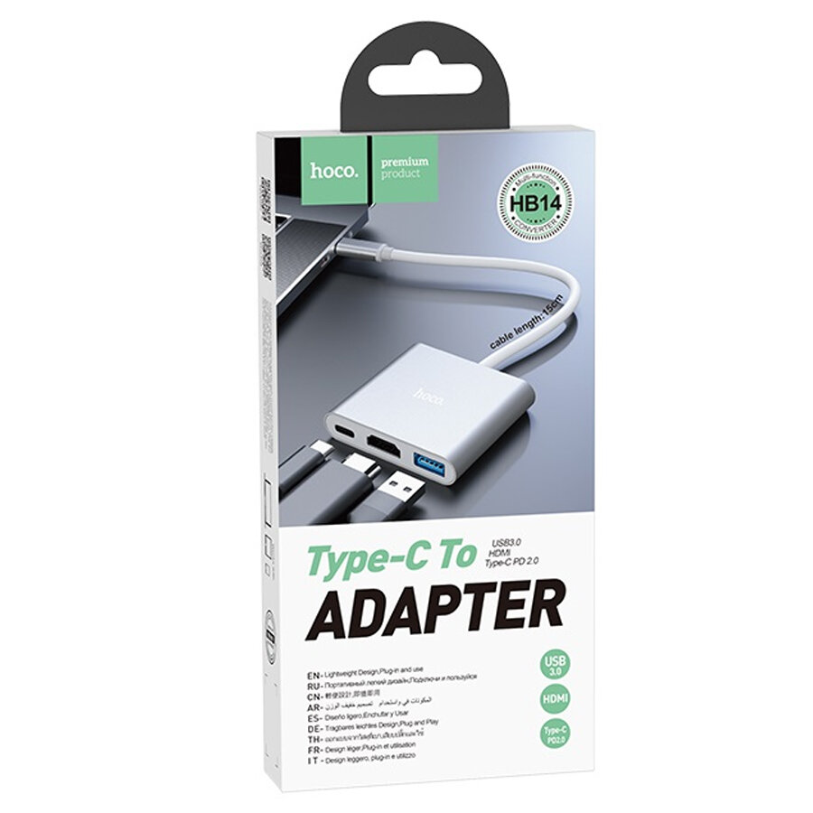 Адаптер Hoco (HB14) USB-C 3 в 1 на USB 3.0/HDMI/PD (Silver)