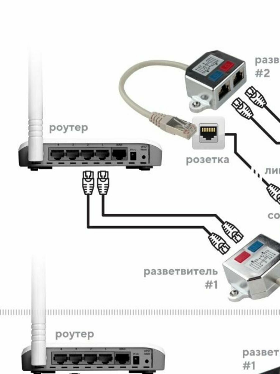 Данное устройство делит и объединяет RJ45, для проведения сигнала с двух RJ45 портов в 2 RJ-45 порта по одному кабелю. Оно НЕ РАЗВЕТВЛЯЕТ один RJ45 выход сетевого оборудования в 2 и подобных разветвителей не существует в природе, покупайте для этой цели маршрутизатор или коммутатор. С обжимными клещами тоже самое можно сделать и бесплатно =) , зато так - красивше. |