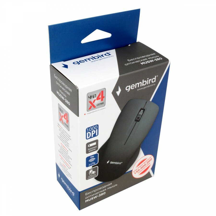 Мышь беспроводная Gembird MUSW-380, 1000 dpi, USB, черный (MUSW-380)