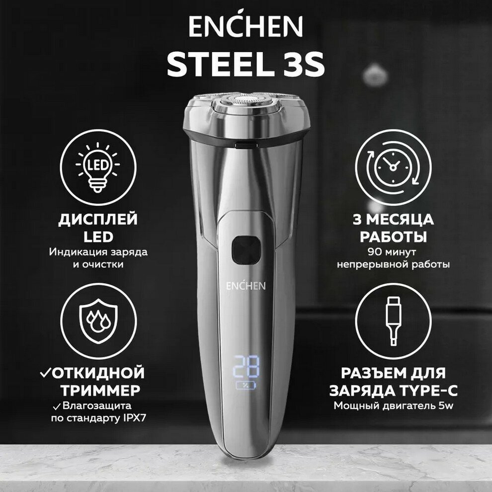 Электробритва мужская Enchen Steel 3S, роторная водонепроницаемая бритва для мужчин электрическая для сухого и влажного бритья, триммер