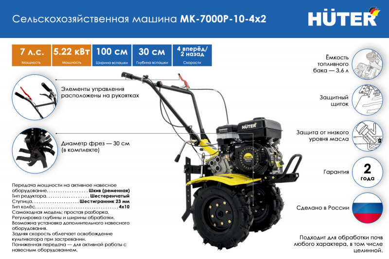Мотоблок HUTER МК-7000P-10-4х2//подарок/5150Вт, 7лс, 100см интересное: