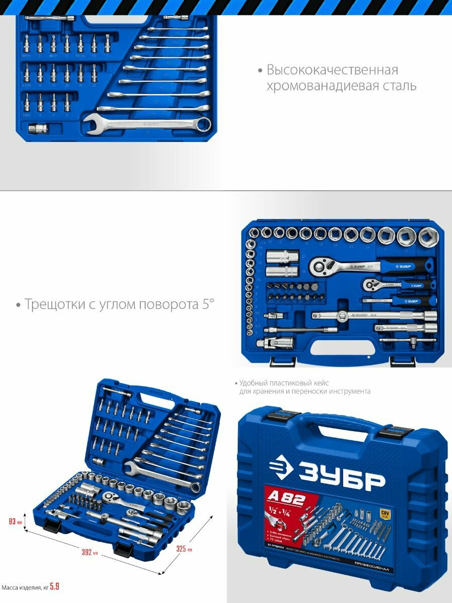 ЗУБР А-82, 82 предм.,(1/2″ + 1/4″), универсальный набор инструмента, Профессионал (27635-H82)