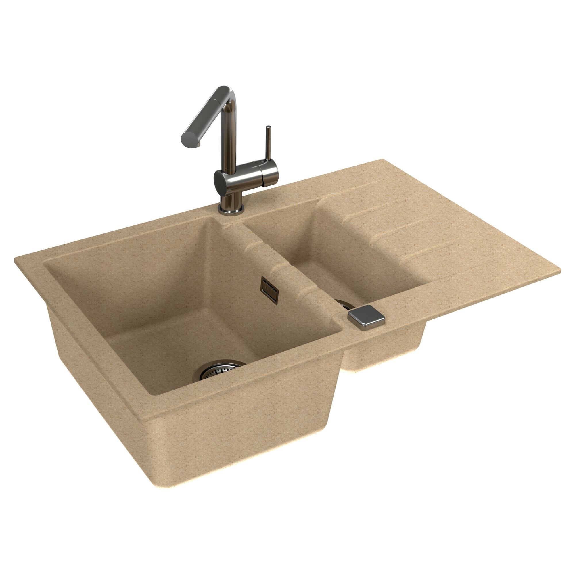Каменная мойка для кухни с двумя чашами и крылом ALVEUS GRANITAL CADIT 70 TERRA - G22 790 X 500 искусственный камень гранит с сифоном. Цвет песчаный