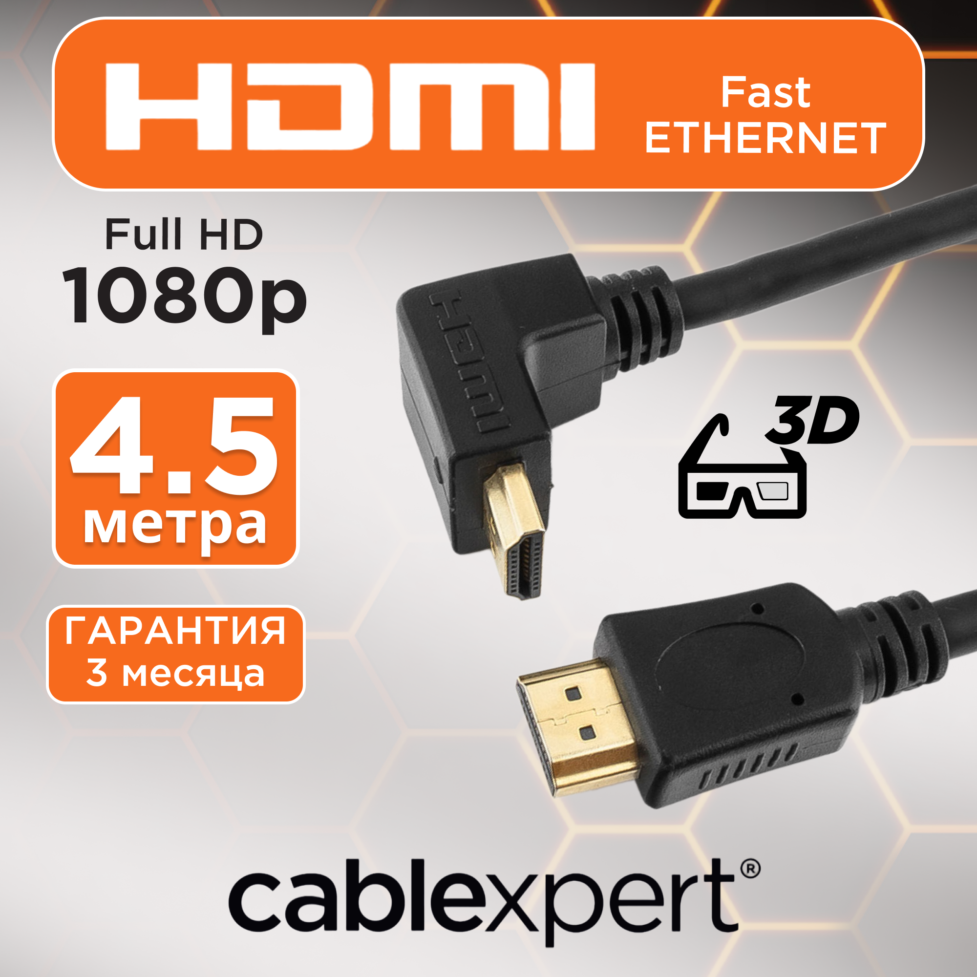 Кабель HDMI Cablexpert , 4.5м, v1.4, 19M/19M, углов. разъем, черный, позол.разъемы, экран