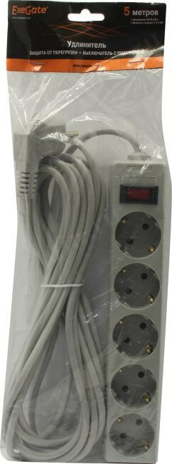 Удлинитель ExeGate EC-5-5G (5 евророзеток с заземлением, 5м, защита от перегрузки, выключатель с подсветкой, серый) EX285800RUS