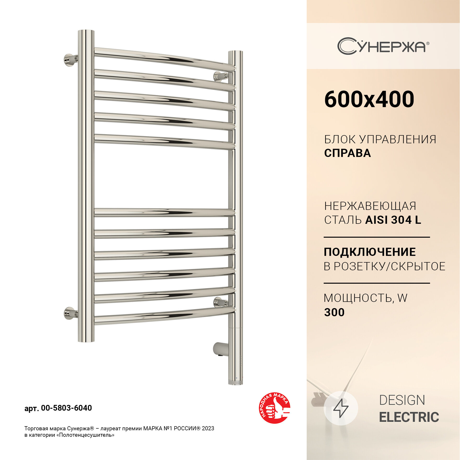 Полотенцесушитель электрический Сунержа Богема 3.0 выгнутая, 600x400, МЭМ правый, сталь полированная 00-5803-6040
