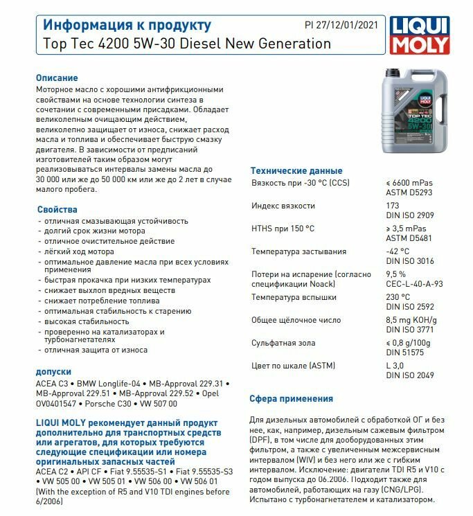 Ниже Вы можете прочитать отзывы на Масло моторное дизельное Liqui Moly 5W30 Top Tec 4200, синтетика, 1литр 2375, ознакомится с подробными характеристиками, посмотреть интересные обзоры и фотографии на Масло моторное дизельное Liqui Moly 5W30 Top Tec 4200, синтетика, 1литр 2375.