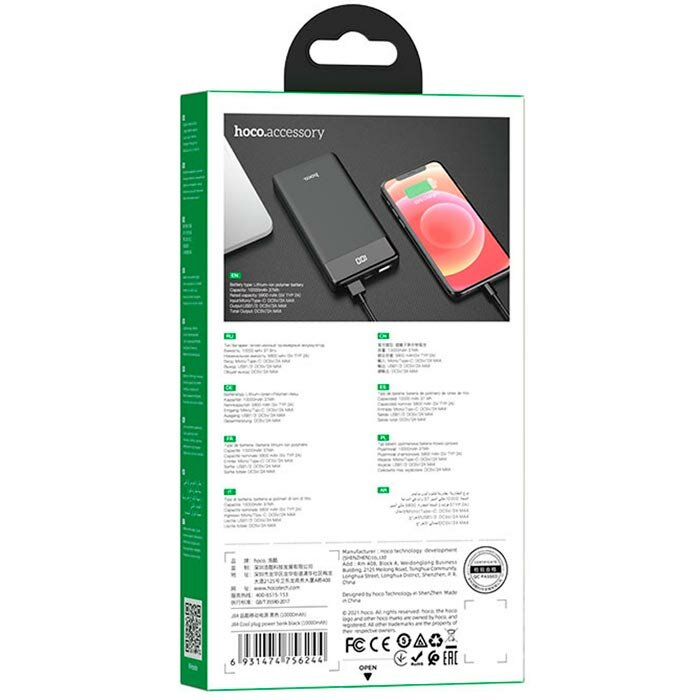Купить Универсальный Доп. Аккумулятор 10000mAh, J84, HOCO, выход 2 USB (5V/2A), вход Micro/Type-C, с дисплеем, черный