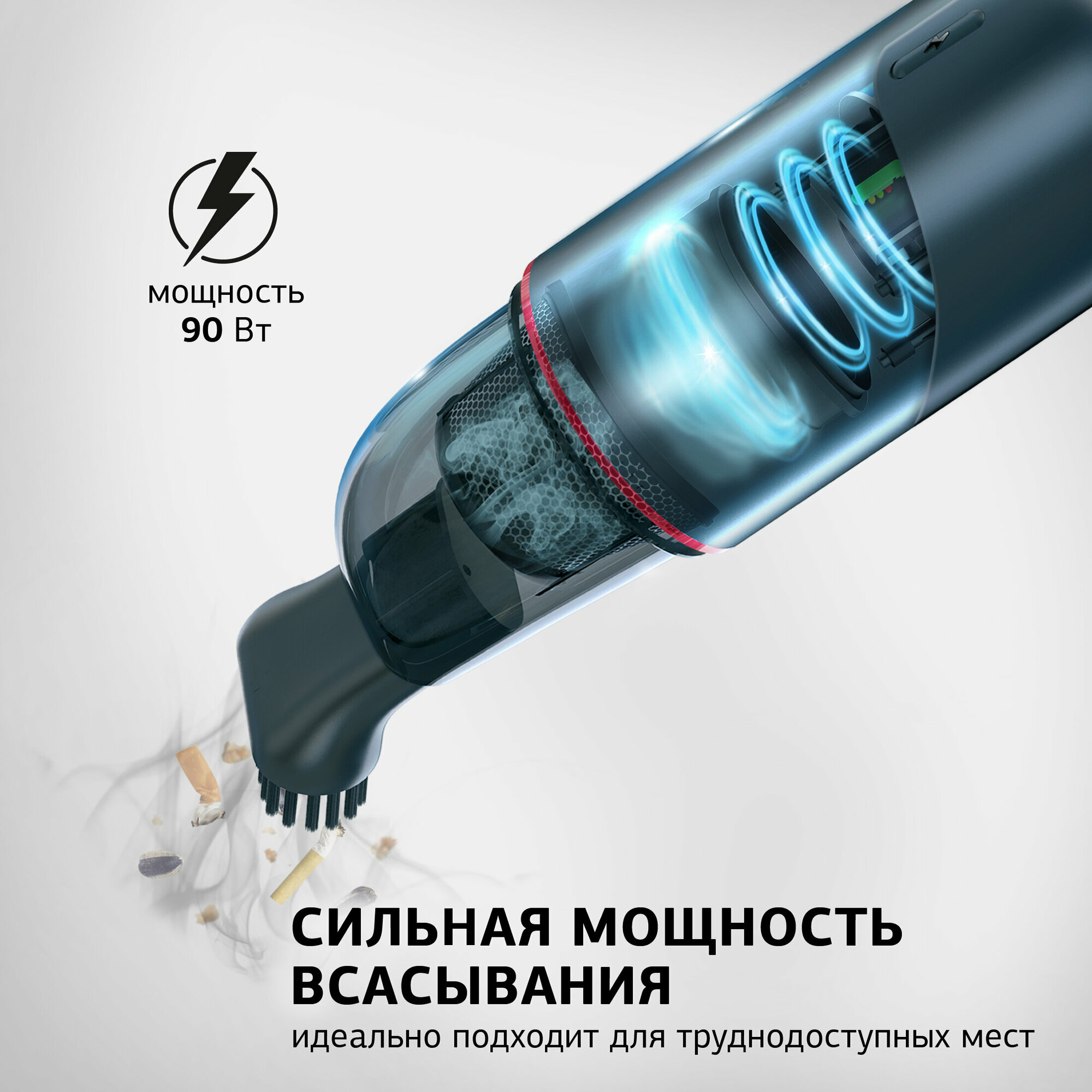 22 беспрерывных минуты работы хватает, чтобы вычистить все щели в машине. Мощность 90 Вт умудряется собрать мусор, даже если насадка не дотягивается. Стильный дизайн и чехол для хранения. |