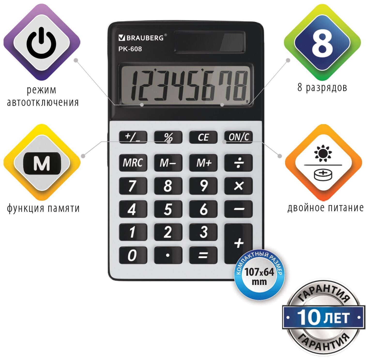 Калькулятор карманный BRAUBERG PK-608 (107x64 мм), 8 разрядов, двойное питание, серебристый, 250518 (цена за 1 ед.товара)