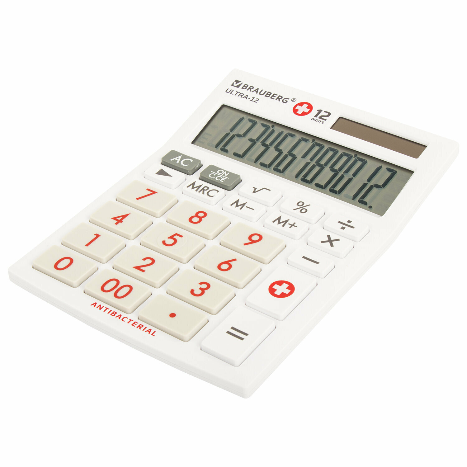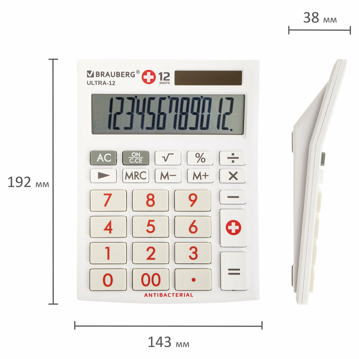 Калькулятор настольный BRAUBERG ULTRA-12-WAB (192x143 мм) 12 разрядов двойное питание антибактериальное покрытие белый, 1 шт